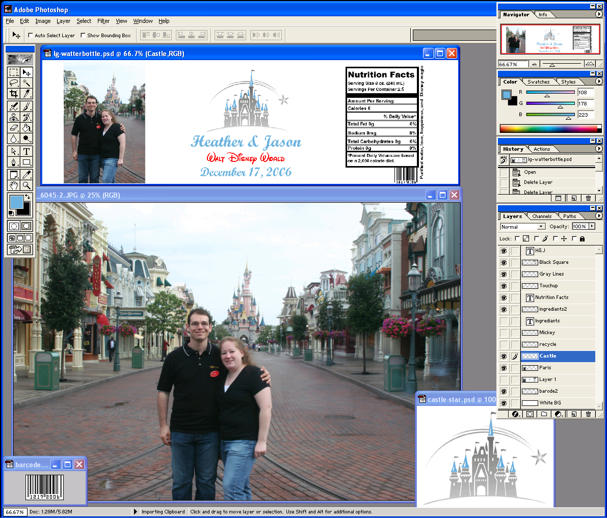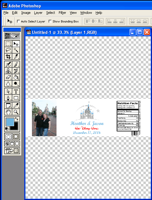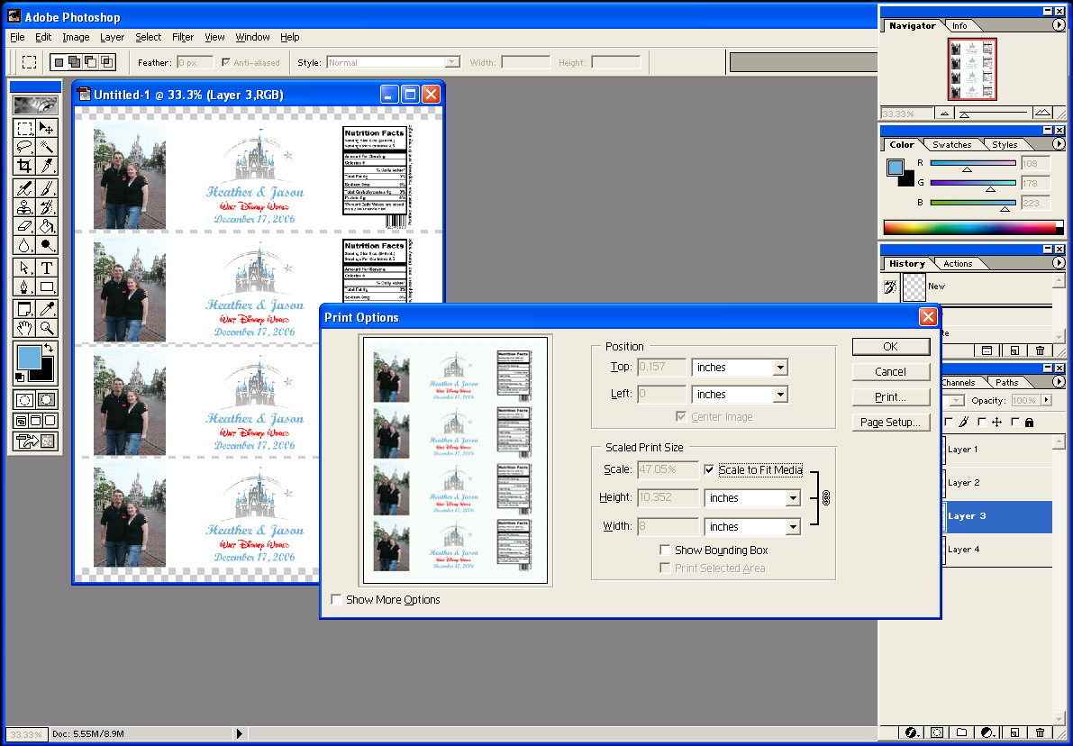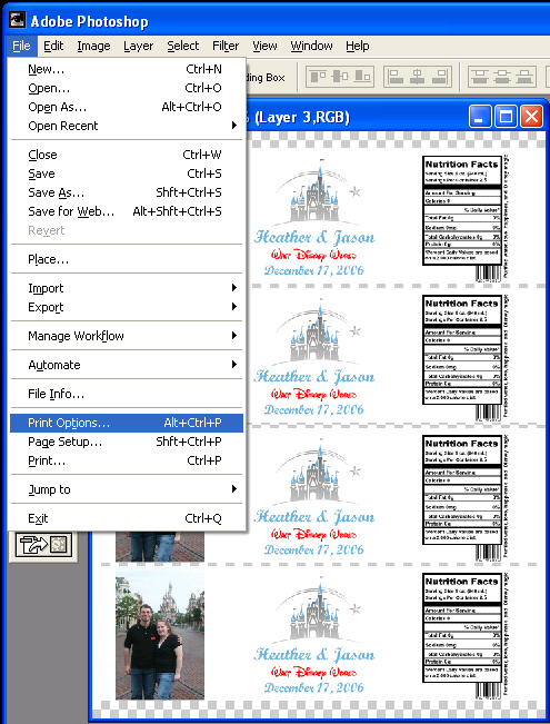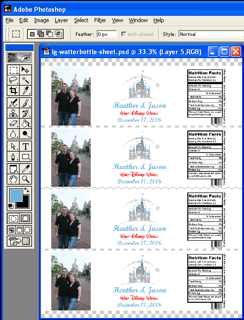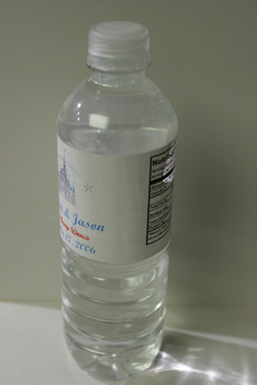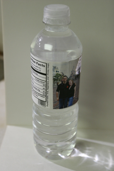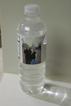 We bought waterproof Xerox paper we found at Staples for about $13. There were 25 sheets, and we were able to get 4 labels to a sheet, which made 100 labels. We chose the laser printing version of the paper, and had Staples print them using their color copier. They have had color printing at 39 cents for a while, the total for the printing was $9.75. We will get the water bottles when we get to Florida, and pack a few Elmers glue sticks. The whole thing cost about $25 for 100 labels. We had originally looked at purchasing labels online or from ebay. It would have cost anywhere from $65 - $140 for 100 labels. Most places charged an extra fee of $25 to add a photo, and you had to choose from a limited selection of templates.