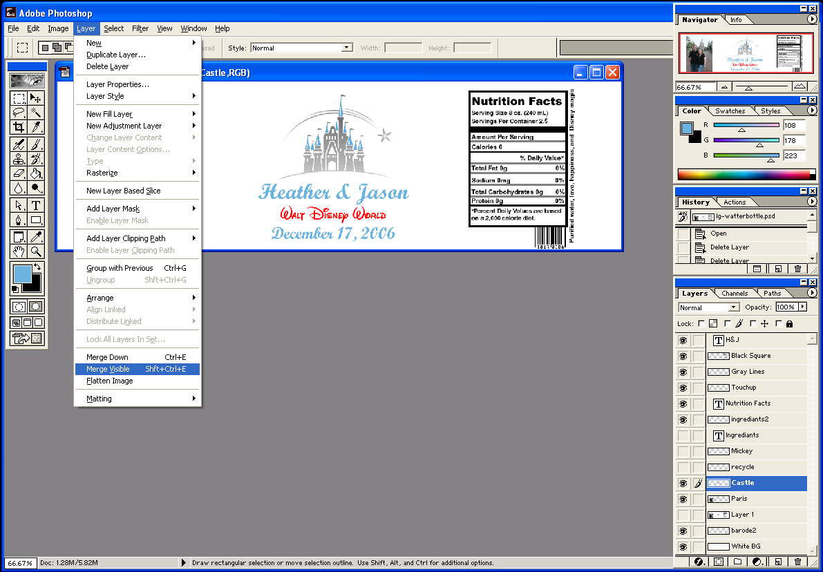 Also remember that you will see less than half of the label at a time. You will want to divide the label into two or three zones. We chose to do one large zone in the middle, and two smaller zones on each side. Another way to configure it is three equal sized zones, where two are the same logo and the third is the nutrition facts.